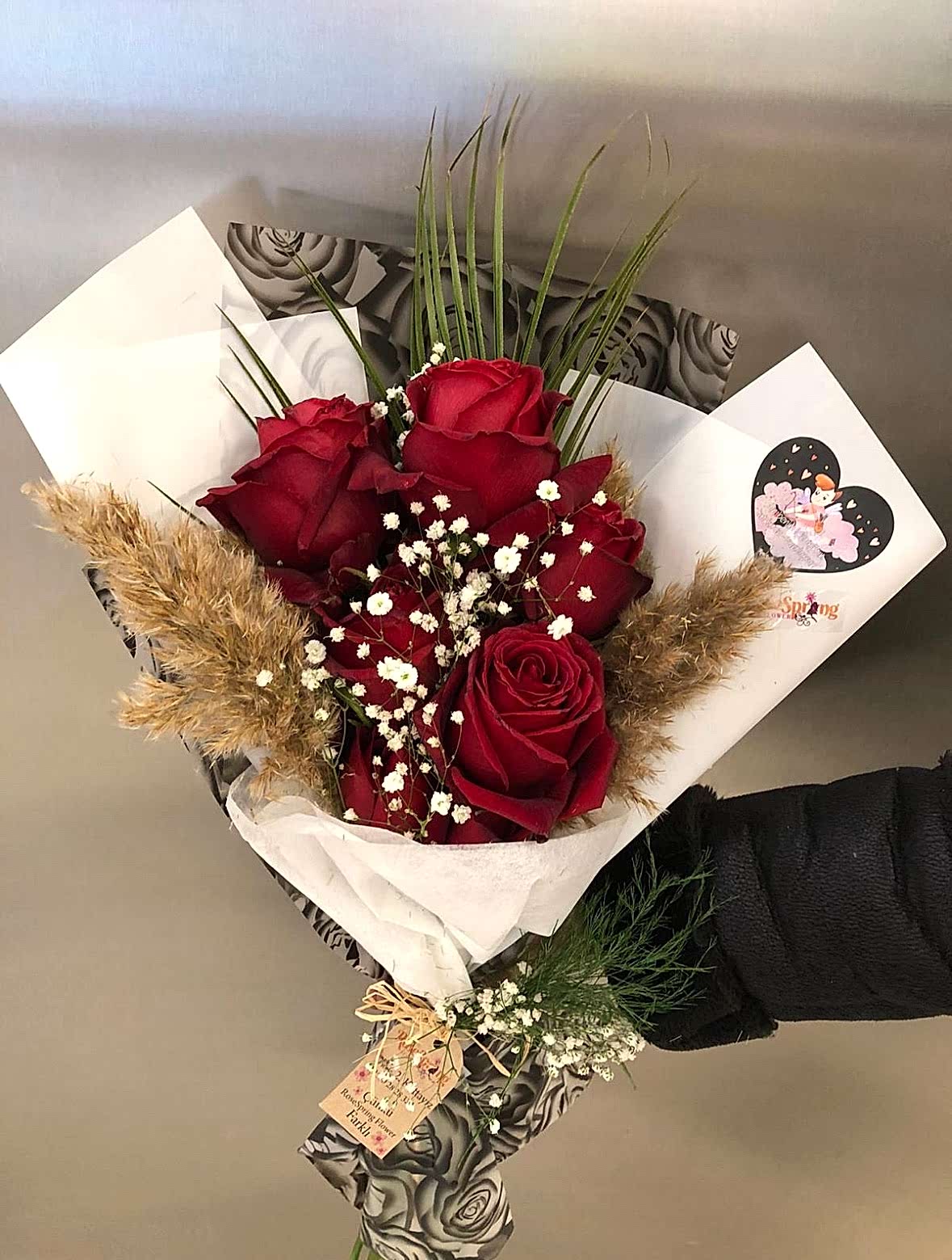 6 Gül cipso yeşillik ve pampas detaylı buket