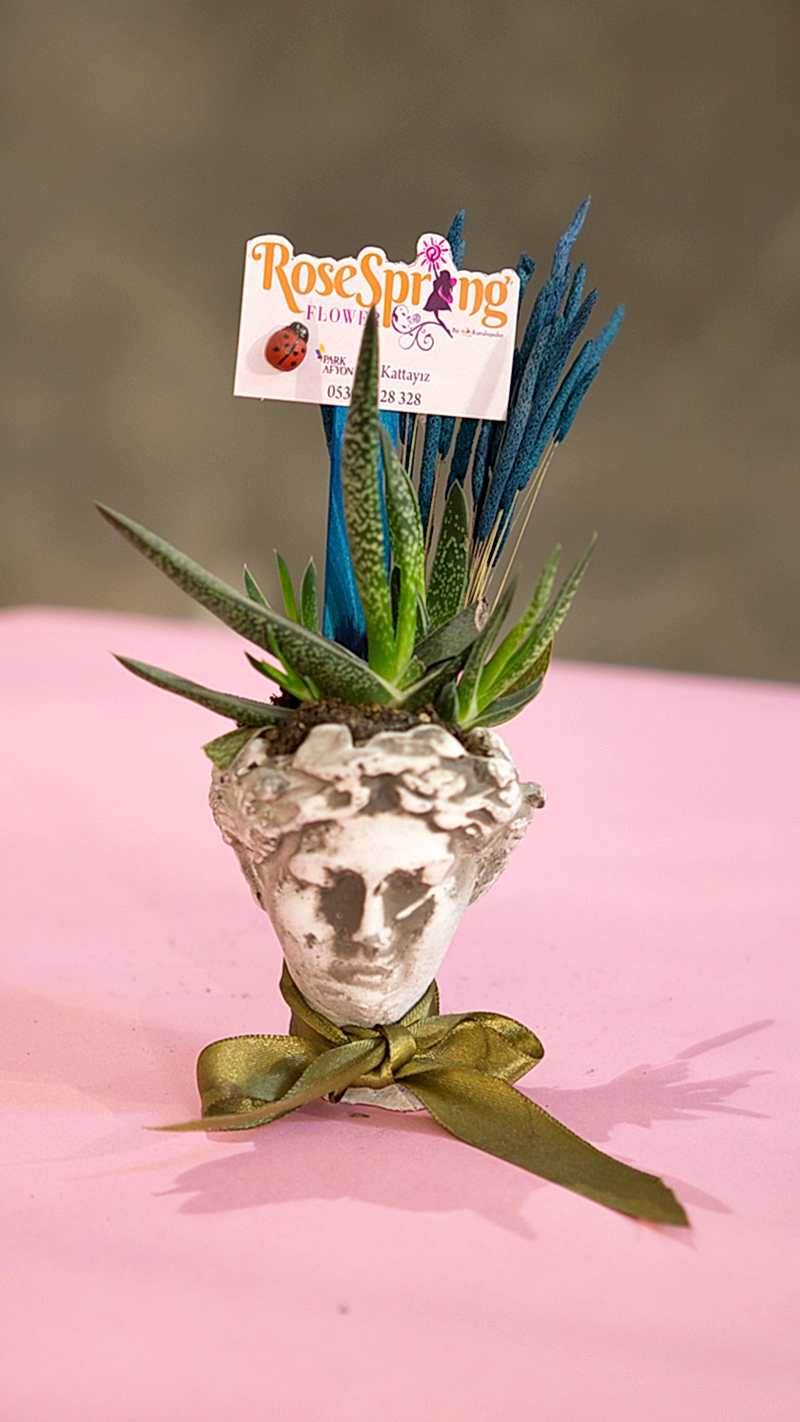 Antik yunan heykeli saksıda sukulent, kuru bitkiler, kurdela ile hazırlanmış hediye çiçek. Ebatı ve yüksekliği ile çalışma masalarında çok yer kaplamaz. Zarif görünümüyle her zevke hitap eder. Sevdikleriniz bu hediyeye bayılacak.