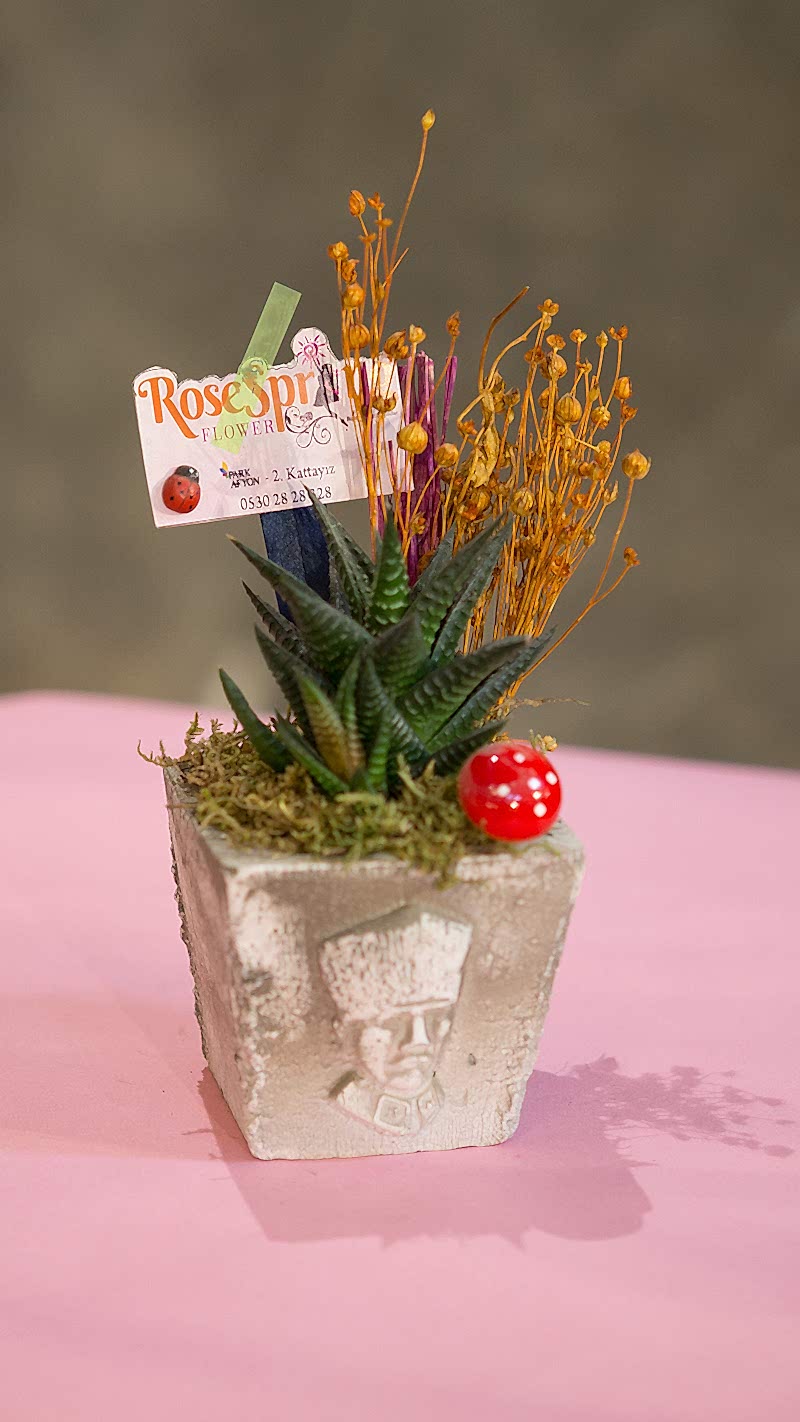 Atatürk büstü desenli, gri renkli, beton saksıda sukulent, mini mantarlar, kuru bitkilerle hazırlanmış özel tasarım çiçek. Ülkemizin kurucusu Yüce Atatürk’ü çalışma masasında görmekten mutluluk duyacak sevdiklerinize hemen alın, kesinlikle çok beğenecekler.