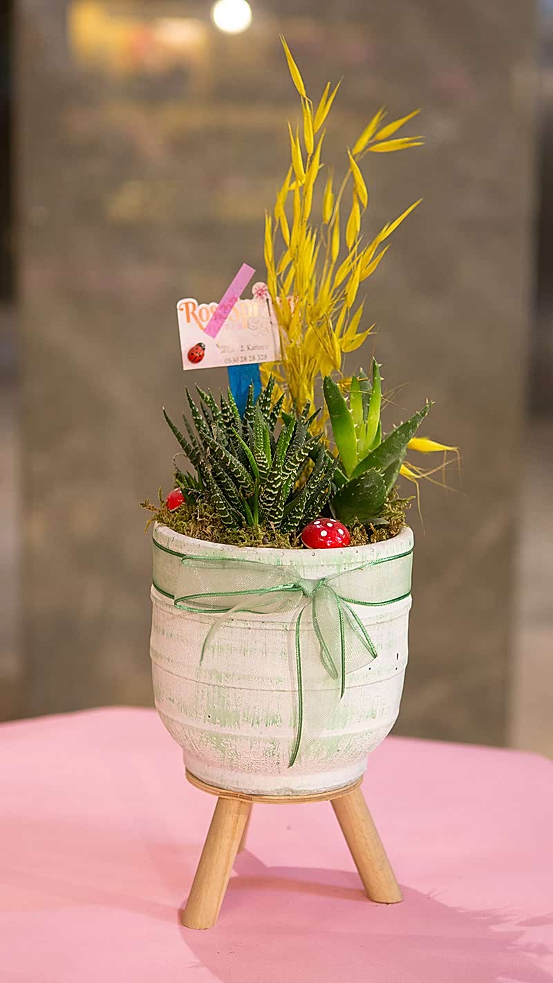 Ayaklı beton saksıda zebra sukulent, mini mantarlar, kuru bitkiler, mini kaktüsler ve kurdela ile süslenmiş saksıda özel tasarım çiçek.