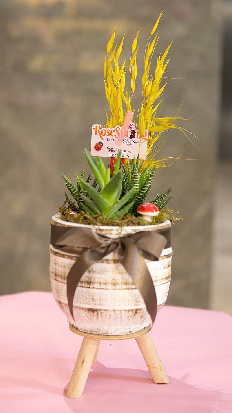 Ayaklı beton saksıda zebra sukulent, mini mantarlar, kuru bitkiler, mini kaktüsler ve kurdela ile süslenmiş saksıda özel tasarım çiçek.