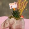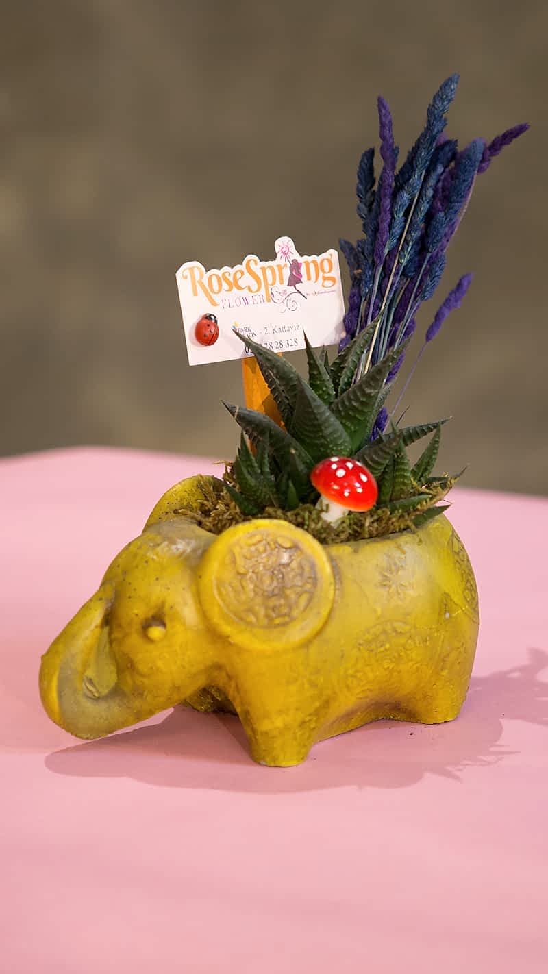 Fil biçiminde, altın sarısı renkte beton saksıda sukulent, kuru otlar, mantarlarla süslenmiş aranjman. Ofise, eve, iş yerindeki çalışma masasına her yere kolaylıkla sığabilen şık bir tasarım.