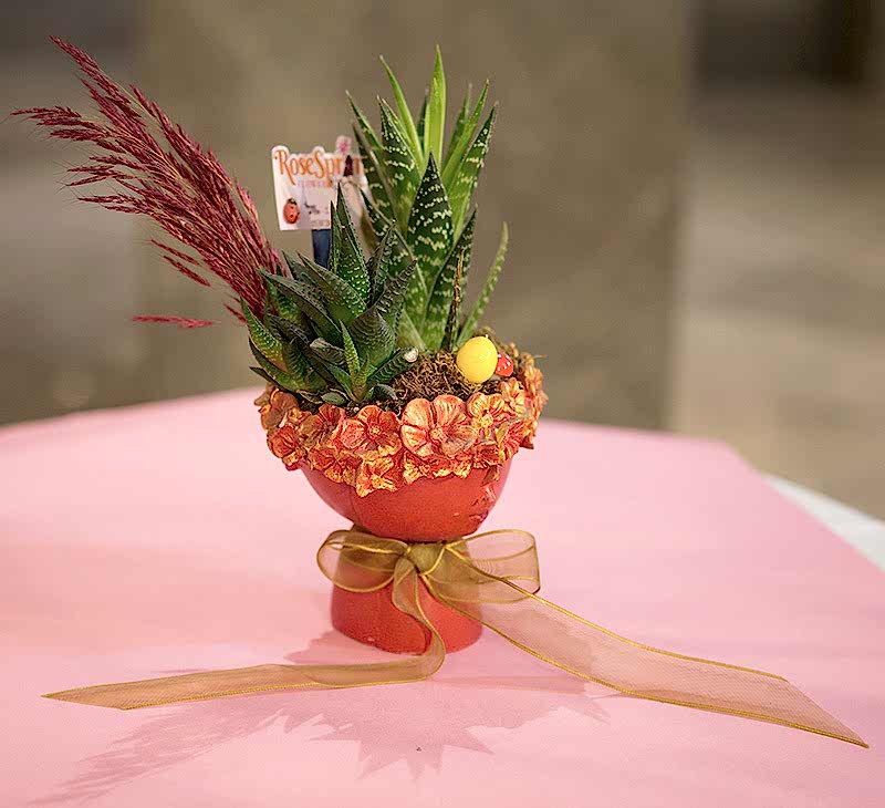 Çiçek desenli, kırmızı renkli, beton saksıda zebra sukulentler, mini mantarlar, kuru bitkiler, kurdelalarla süslenmiş hediye çiçek. Ebatı ve yüksekliği ile çalışma masalarında çok yer kaplamaz. Zarif görünümüyle her zevke hitap eder. Sevdikleriniz bu hediyeye bayılacak.