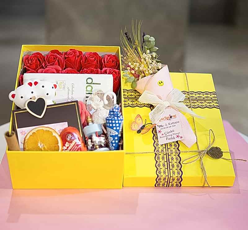 Çiçekli çikolatalı sarı hediye kutusunun içeriğinde damak antep fıstıklı çikolata, atlı karınca, kar küresi, mini çift ayıcık, dekoratif mum, yapay güller, kapalı şemsiye şeklinde çikolata, kalpli çikolata, çubuk tarçın, kuru meyve, not kartı bulunuyor. Kapağında minik kelebek, kuru çiçek ve bitkiler, kurdela, jüt ip kurdela, tüller ve mühür bulunuyor. Sevdikleriniz bu hediyeye bayılacak. Dolu dolu bir hediye kutusu.