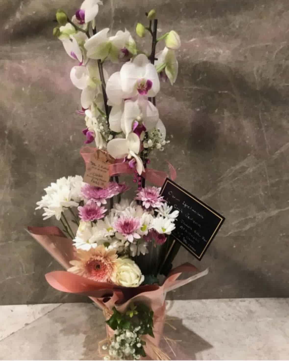Çift Dallı İçi Pembe, Beyaz Orkide, Çiçeklerle Aranjmanlanmış