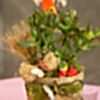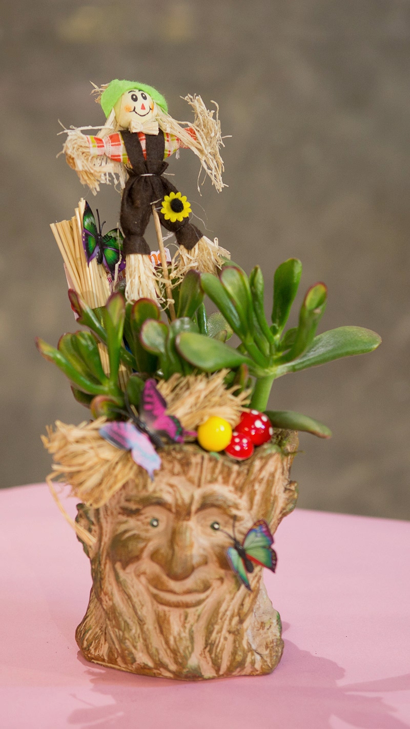 Gülen ağaç şeklinde beton saksıda para çiçeği (crassula ovata), sevimli korkuluk, kelebekler, mini mantarlar, kuru otlar, kurdelalarla süslenmiş aranjman. Sevdikleriniz bu hediye çiçeğe bayılacak.