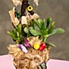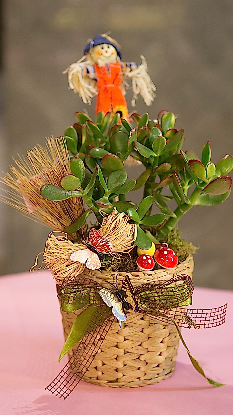 Hasır saksıda crassula ovata, sevimli korkuluk, kelebekler, mini mantarlar, kuru otlar, kurdelalarla süslenmiş aranjman. Sevdikleriniz bu hediye çiçeğe bayılacak.