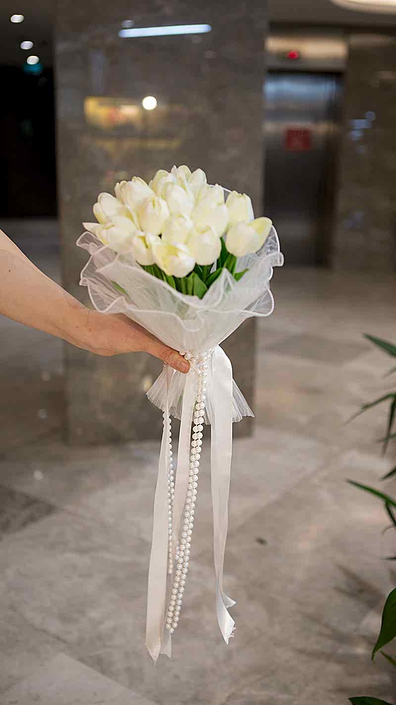 Islak lale gelin eli buketi, incili, tüllü, beyaz kurdelalı, ortalama 15 adet ıslak laleli, canlı görünümlü yapay gelin buketi. Son dönemlerin trend gelin çiçeklerinden bir tanesi.