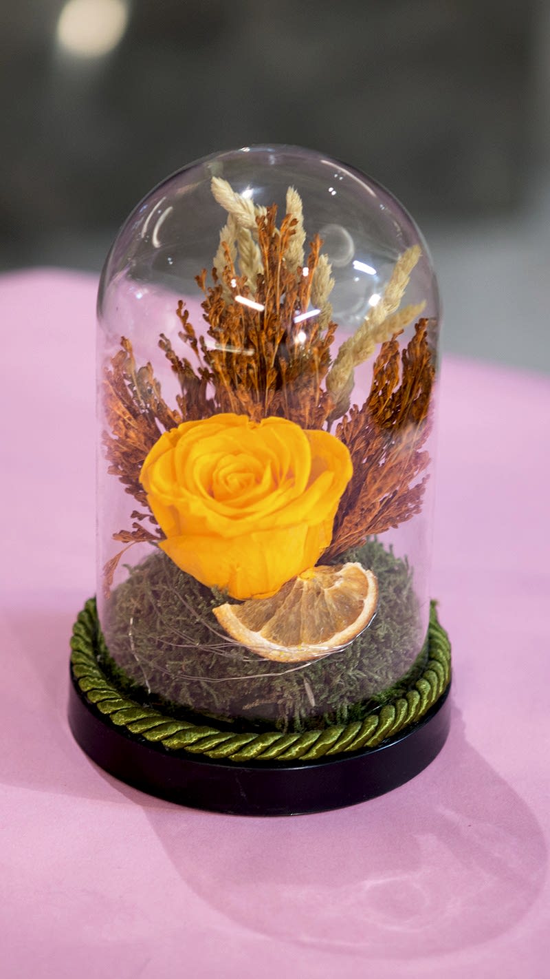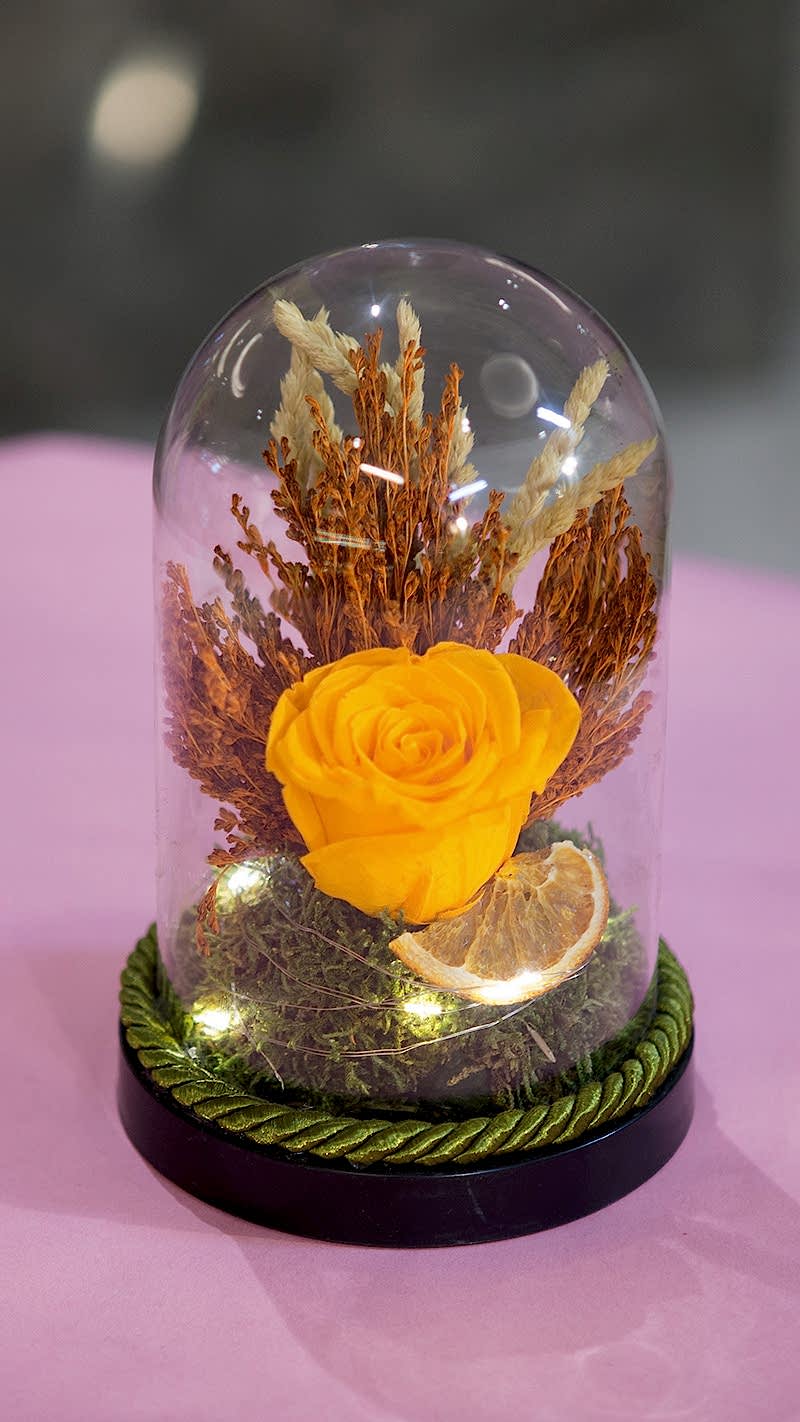 Kapaklı kutuda ışıklı koyu sarı gül tasarımında kuru bitkiler, bitki dalları, yapay sarı gül, mini ışıklandırma, yosun, kuru meyve, fanus ve altın sarısı taban bulunmaktadır. Yazdırmak istediğiniz notu ödeme öncesi siparış notları bölümüne yazınız.