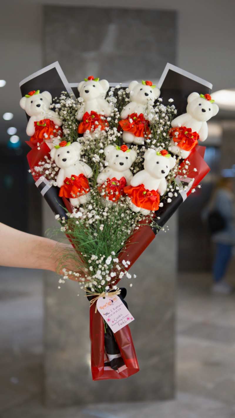 Bukette 7 adet kırmızı kıyafetli beyaz ayıcık, ayıcıkların arasında ve tabanda cipso çiçekleri, kurdela bulunuyor. Çok sevilen, çok satan bir buketimizdir.