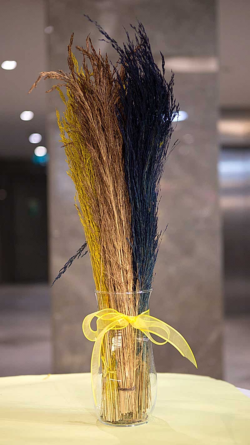 Lacivert, kahverengi, sarı renkli kuru bitki demeti. Ürüne cam vazo dahil değildir. Fiyat tek bir bağ için geçerlidir.