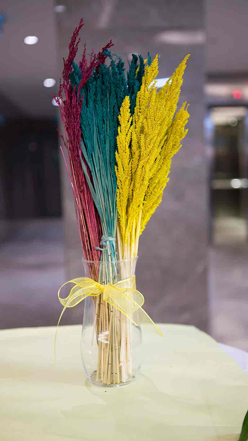 Bordo, yeşil, sarı renkli kuru bitki demeti. Ürüne cam vazo dahil değildir. Fiyat tek bir bağ için geçerlidir.