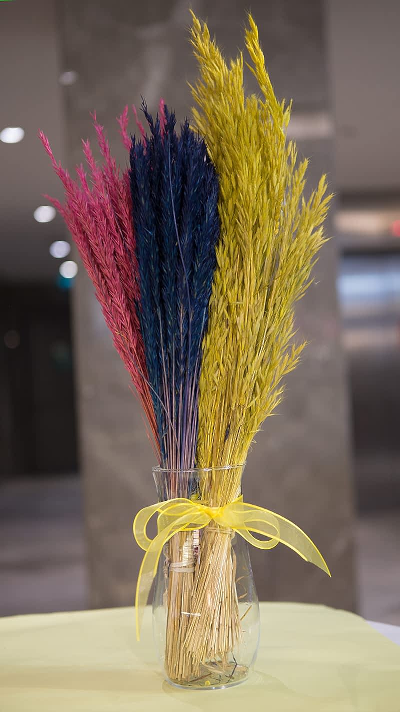 Lacivert, pembe, sarı renkli kuru yulaf demeti. Ürüne cam vazo dahil değildir. Fiyat tek bir bağ için geçerlidir.