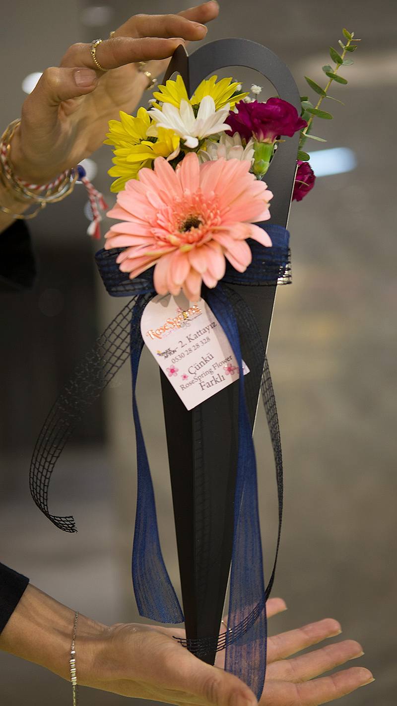 Kutulu canlı çiçek buketinin, kalp şeklinde askısı, sevimli kutusu, kurdelaları var, içinde canlı gerbera, papatyalar, karanfil, cipso ve yeşil dallar bulunuyor. Özel günlerde toptan sipariş verebilirsiniz. Çok zarif bir bukettir.