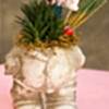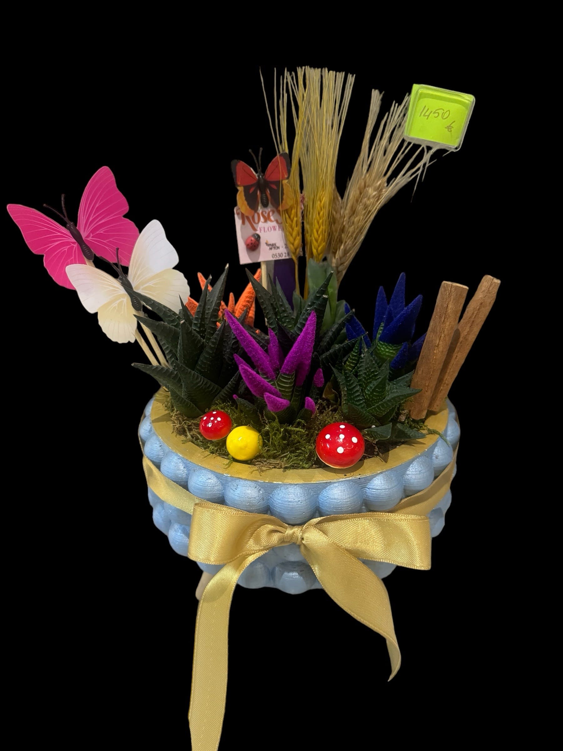 Geniş çaplı, mavi beton saksıda zebra sukulentler. Çok dallı sukulentler, geniş beton saksı, ahşap ayaklar, mini mantarlar, kuru bitkiler, mini mantarlar, jüt ipli kurdela, yosunlarla süslenmiş özel tasarım hediye çiçek.