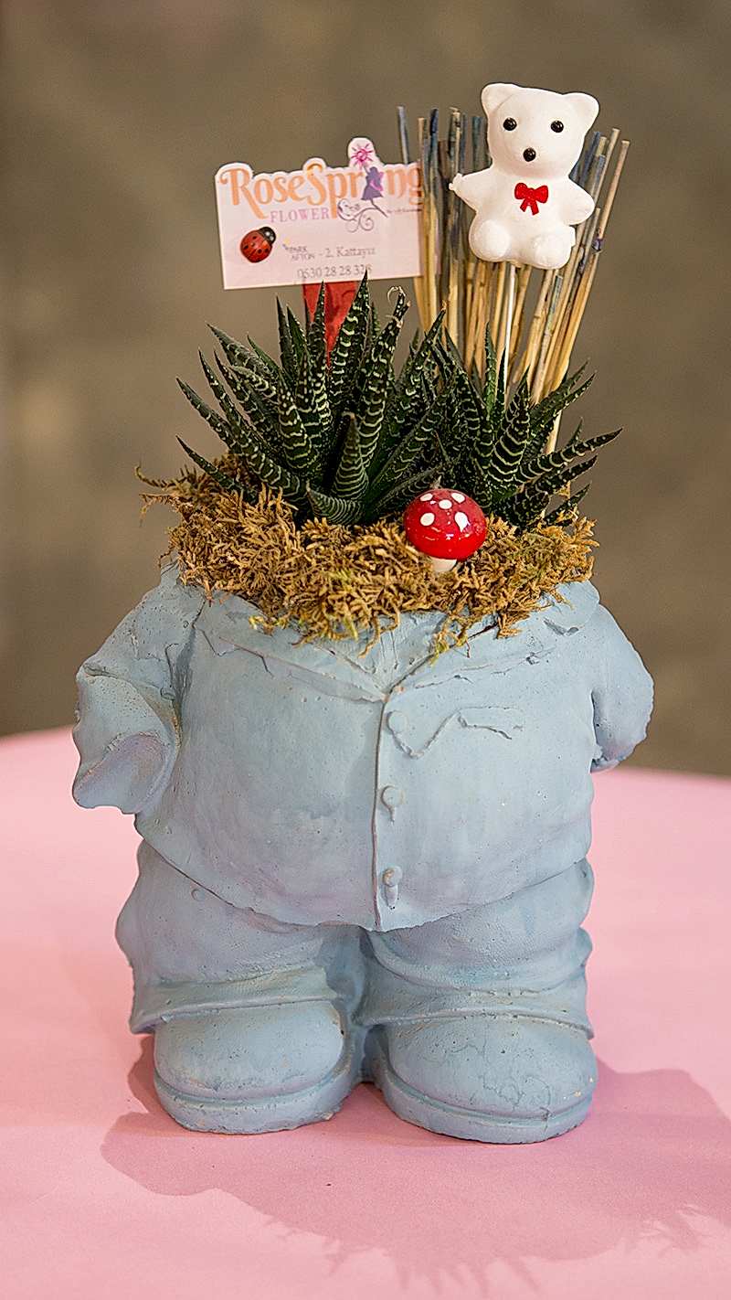 Mavi renkli şişman adam saksıda sukulent