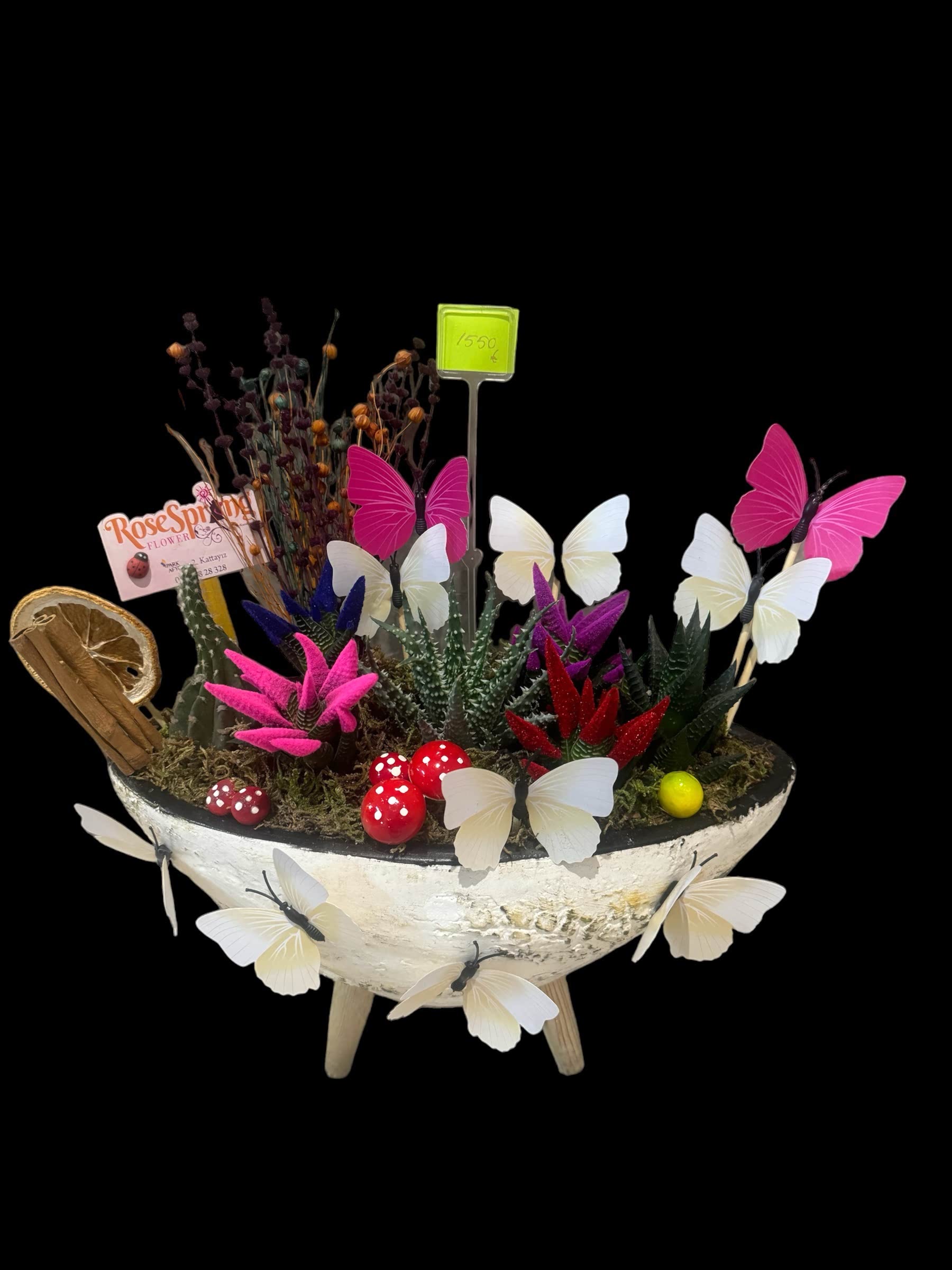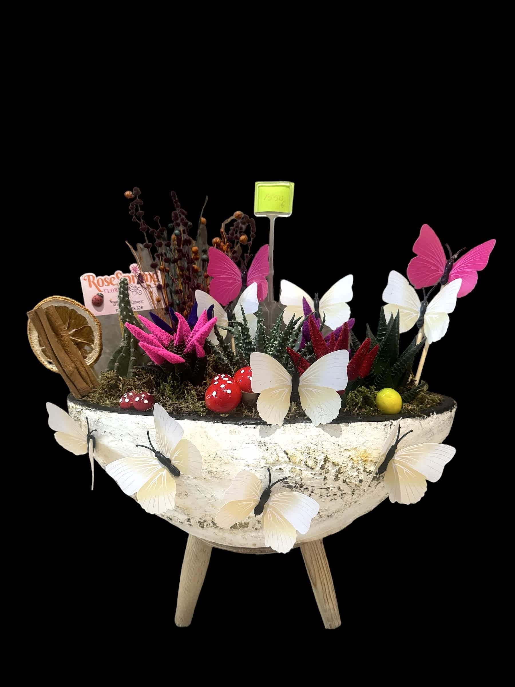 Açık kahverengi, mermer desenli beton saksıda çok dallı zebra sukulentler, ahşap ayaklar, mini mantarlar, kelebekler, kuru meyvelerle süslenmiş ve hazırlanmış hediye çiçek. Özel yapım saksısı ile hem bir dekorasyon ürünü hemde bir canlı çiçek. Sevdikleriniz bu hediyeye bayılacak.