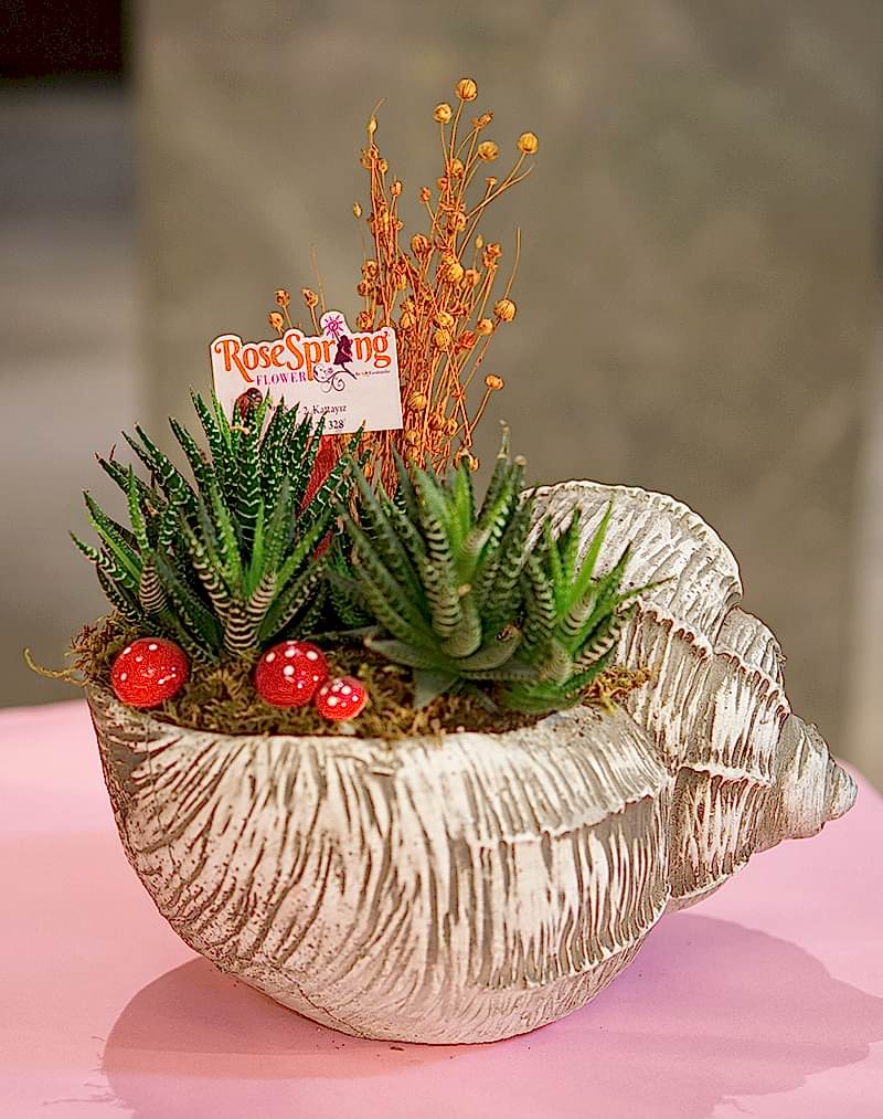 Betondan yapılmış salyangoz şeklinde saksı, çok dallı zebra sukulent, mini mantarlar, kuru bitkilerle süslenmiş hediye çiçek. Yaklaşık üç kilogram ağırlığa sahip bir ürün. Hem şık bir dekorasyon aksesuarı hem canlı çiçek olarak satın alabilirsiniz. Tamamen özel tasarım ürünler, Türkiye’de ilk defa Rose Spring Flower’da.