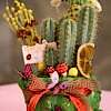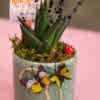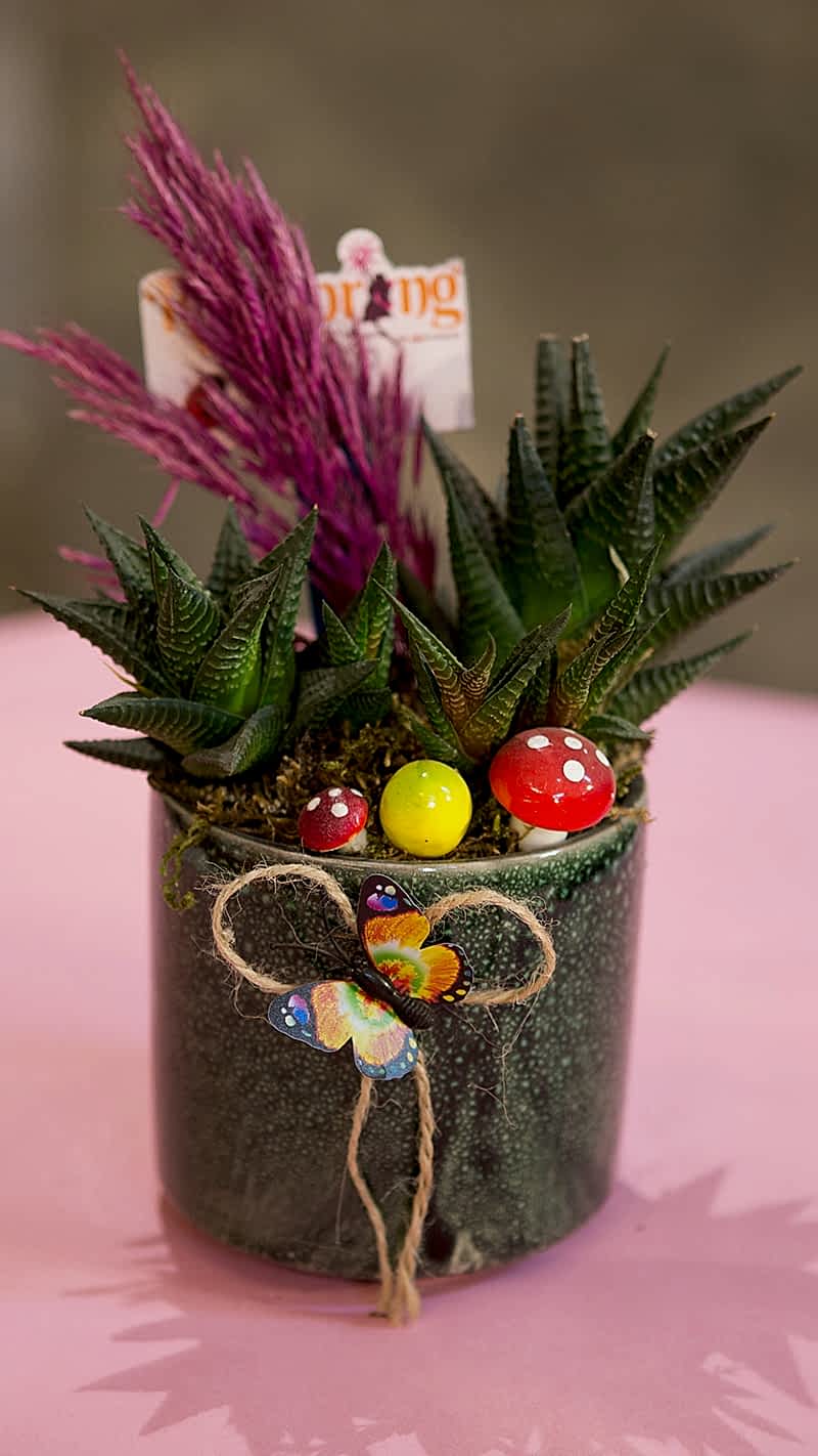 Koyu yeşil seramik saksıda çok dallı zebra sukulent, mini mantarlar, kuru bitkiler, kelebekler, yosunlarla hazırlanmış hediye çiçek.