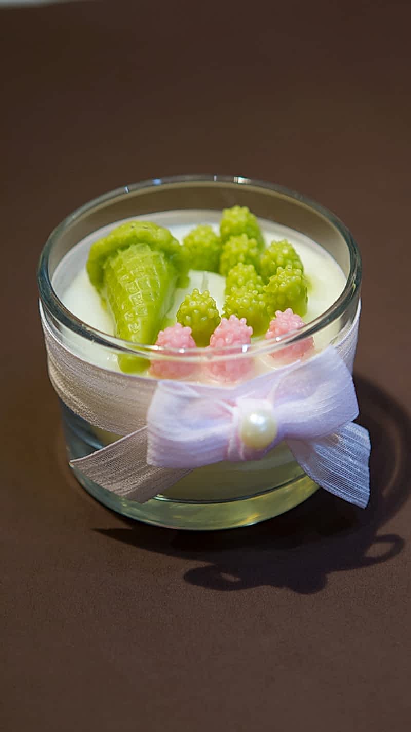 Vanilya kokulu el yapımı mum, üzerinde incili kurdela, mumun üst kısmında pembe ve yeşil dondurma motifleri bulunur. Görünümü ve kokusu çok hoştur. ister aydınlatma isterseniz dekoratif olarak kullanabilirsiniz.
