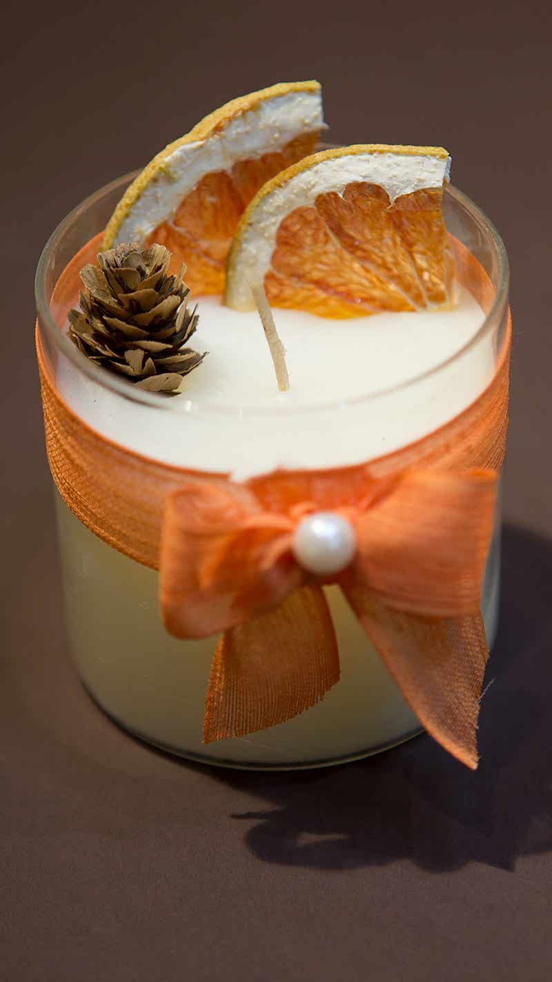 Vanilya kokulu el yapımı mum, üzerinde incili turuncu kurdela, mumun üst kısmında kurutulmuş limon ve portakal dilimleri, mini kozalak bulunur. Görünümü ve kokusu çok hoştur. ister aydınlatma isterseniz dekoratif olarak kullanabilirsiniz.