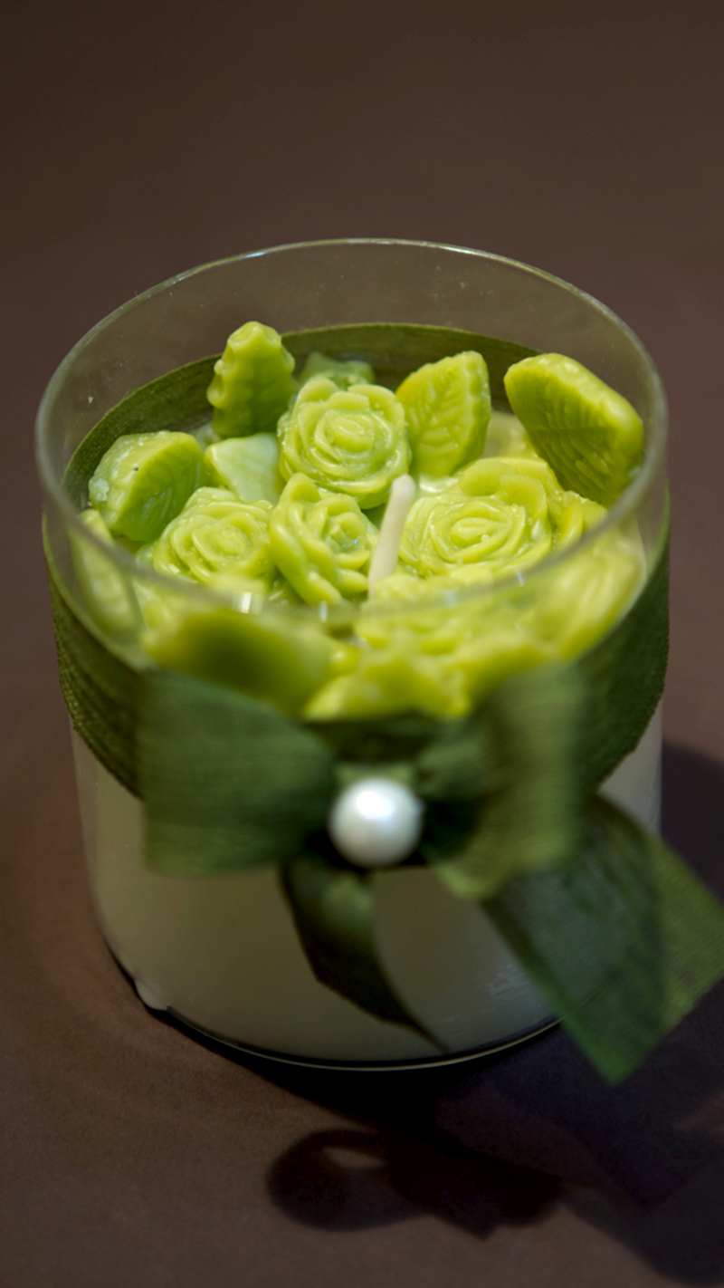 Vanilya kokulu el yapımı mum, üzerinde incili yeşil kurdela, mumun üst kısmında mini güller bulunur. Görünümü ve kokusu çok hoştur. ister aydınlatma isterseniz dekoratif olarak kullanabilirsiniz.